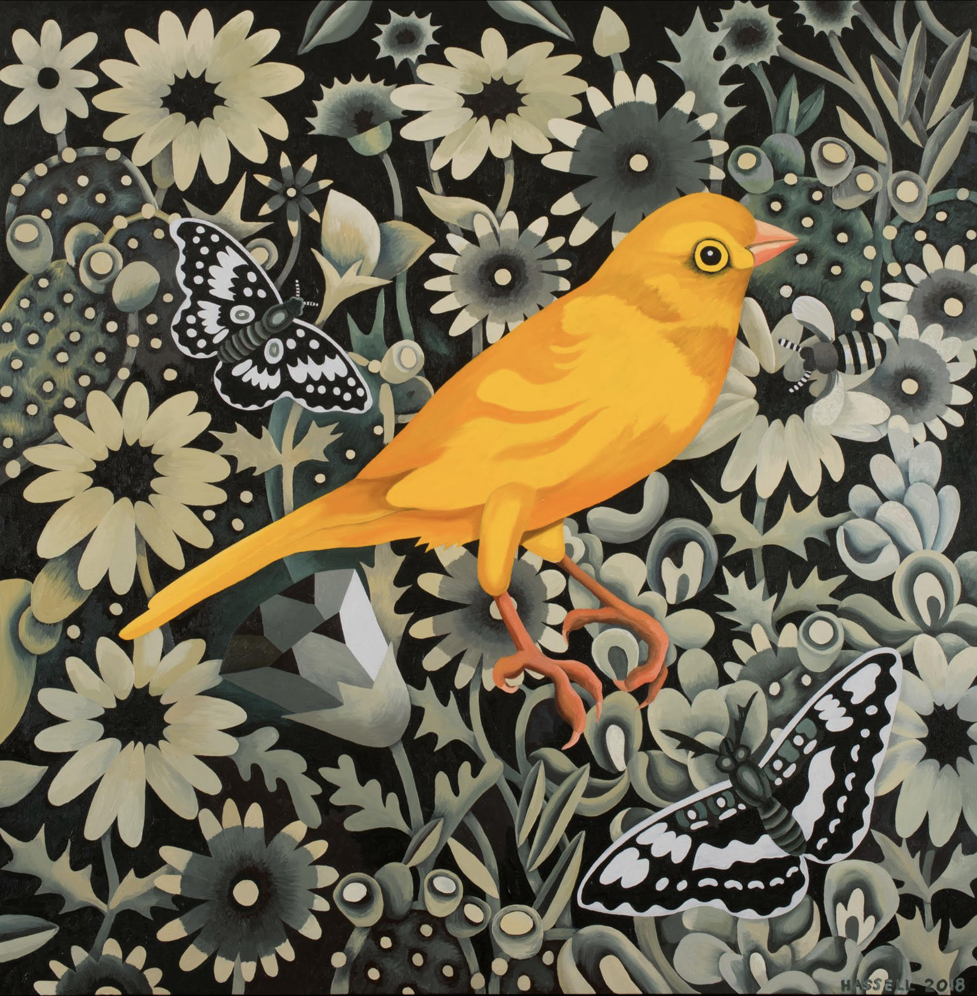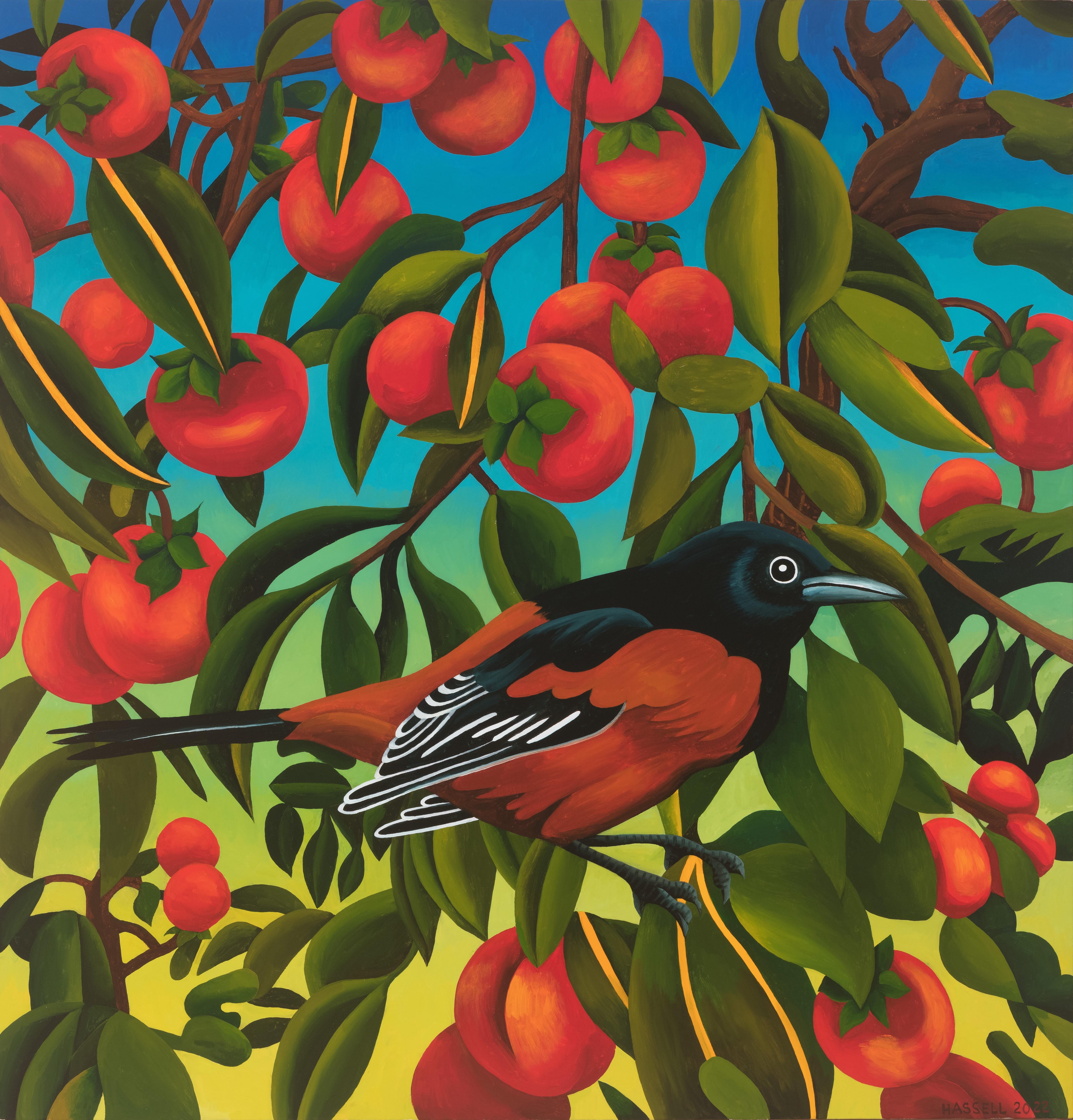 The theme that informs Hassell’s paintings the most is the interconnectedness of nature and natural history as opposed to the politics of conservation.