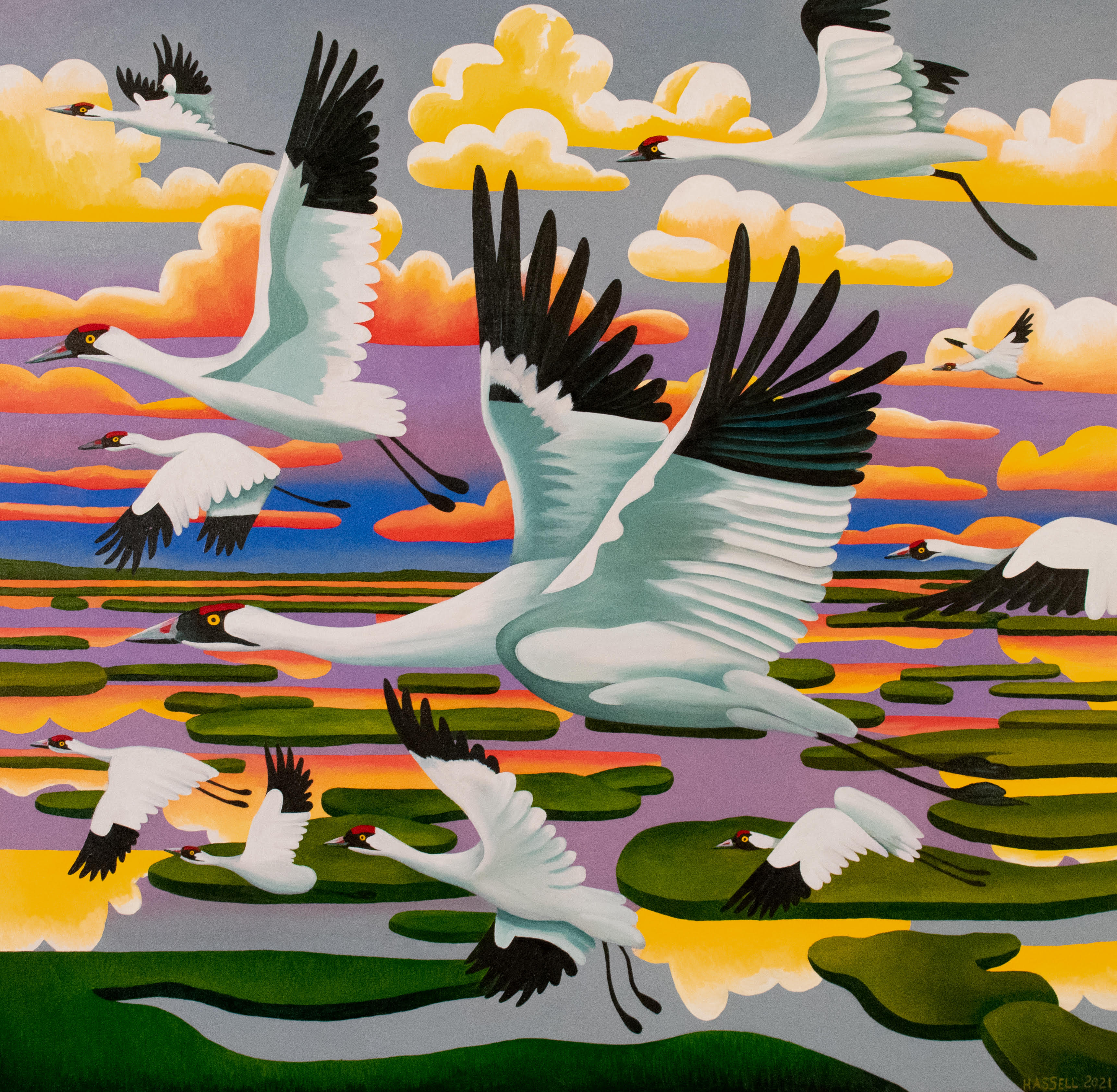"Whooping Cranes over Salt Marshes" by Billy Hassell