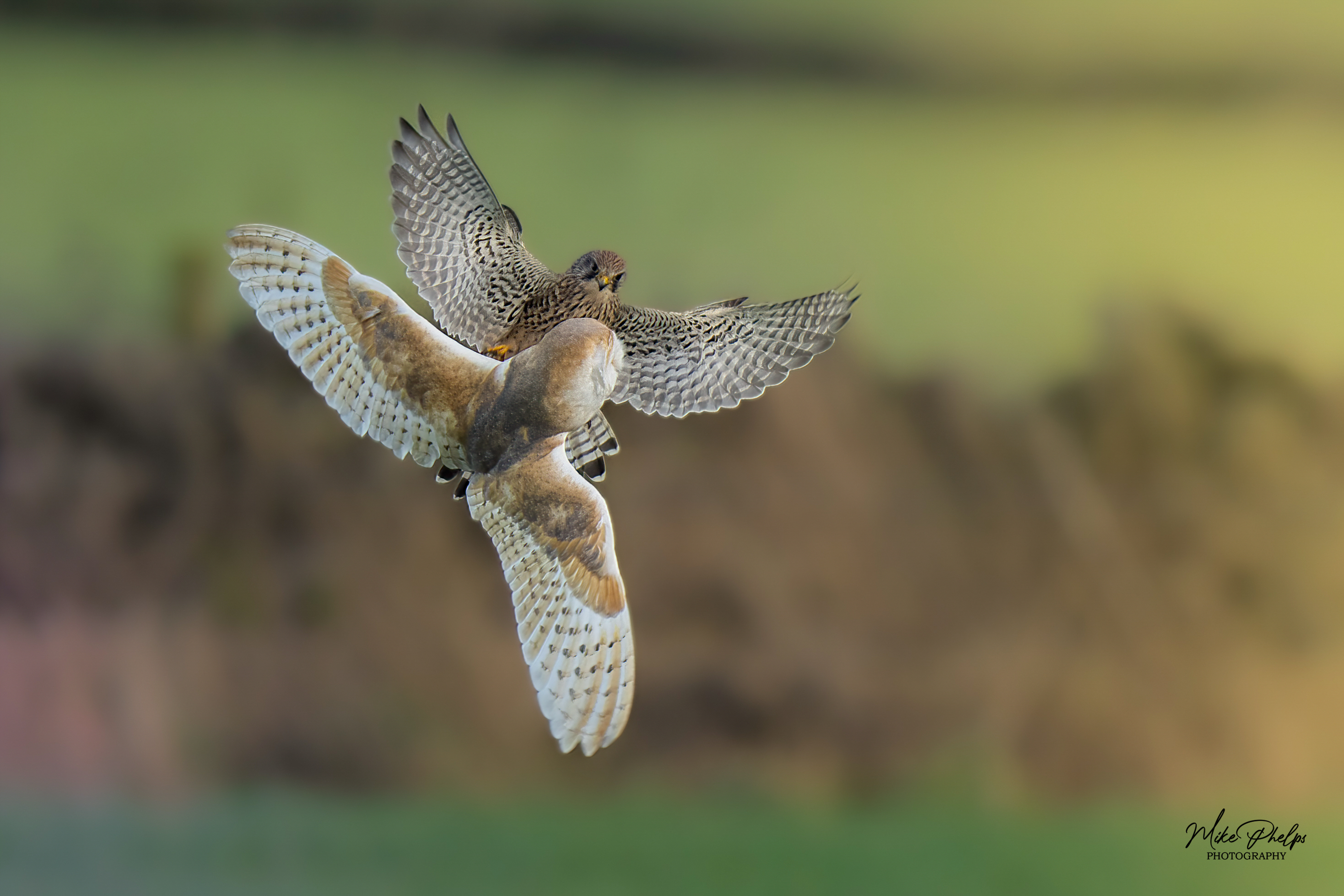 A barn owl and kestrel duel in mid-air. Phelps said owls, silent and mysterious, are his favorite subjects. Photo by Mike Phelps Photography