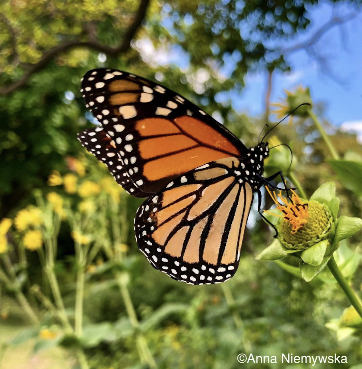 A monarch butterfly pollinates a Canadian flower. Photo by Anna Niemywska | Instagram