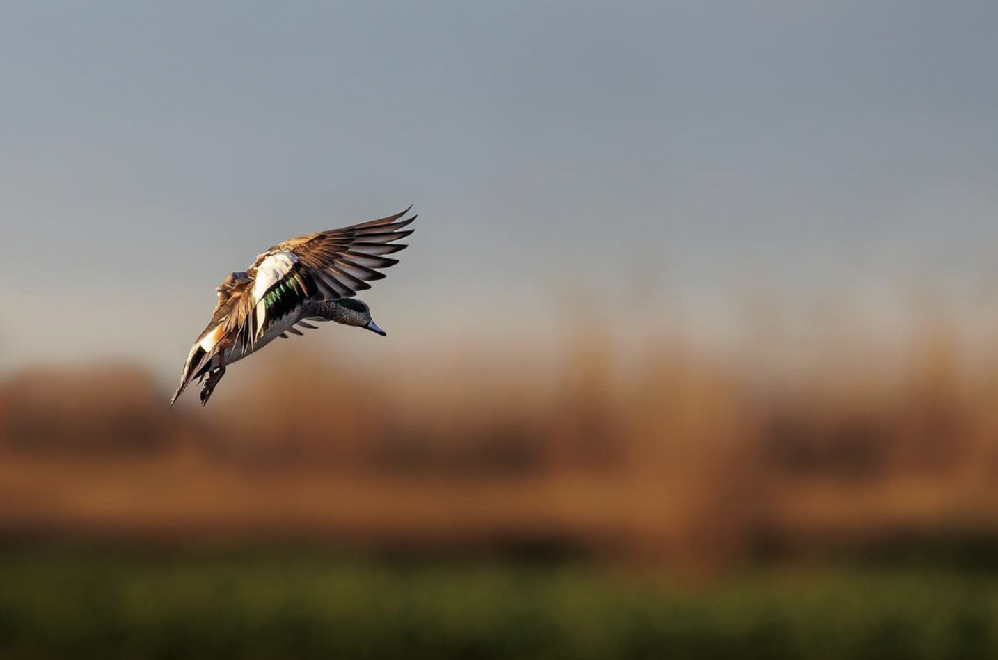 A landing American Wigeon reveals the bold white wing patch and brilliant green speculum. Photo by Edgar Molina | Instagram