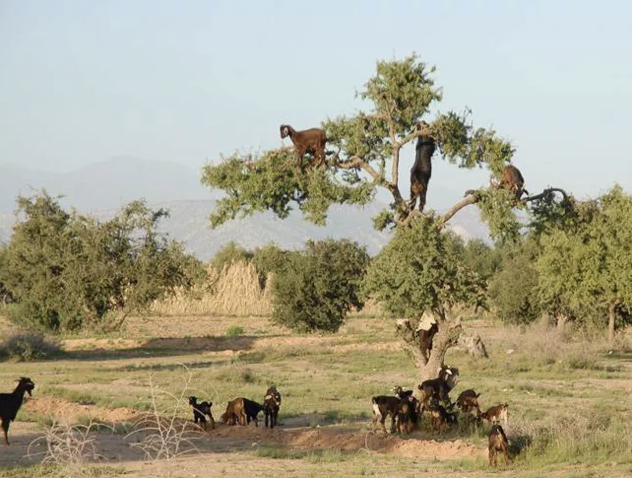 In southwest Morocco where food is scarce, goats are often spotted 30 feet up in argan trees, balancing of narrow branches like hooved ballerinas. They do this to eat the fruit off the trees. People in the area can use the fruit cores to make cold-pressed oil for cooking and skin treatment, so when they are spat out or end up in goat droppings they're collected and put to good use.