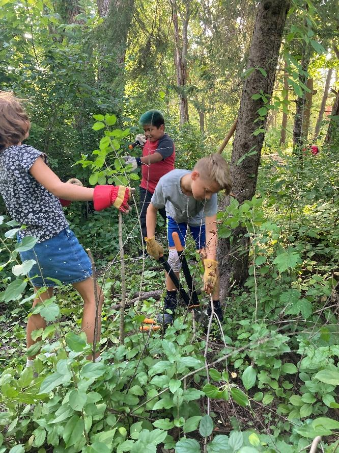 After school program participants cut buckthorn. Courtesy of Aldo Leopold Nature Center