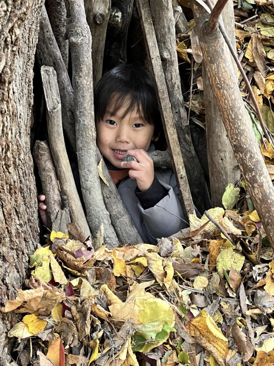 Peeking out of a fort. Courtesy of Aldo Leopold Nature Center